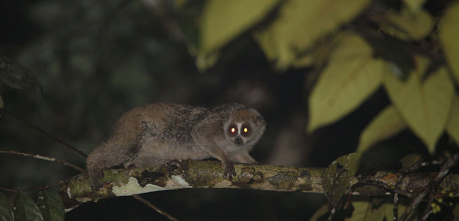 The Greater Slow Loris is a nocturnal primate, i.e. it is active in the night. Just like a cat, slow lorises' eyes reflect a bright orange eye shine. Finding this animal requires spotlighting and very keen eyesight in the dark. When you do find a loris, please do not keep flashing the torchlight at them! Their eyes will be damaged. The slow lorises (genus Nycticebus) are also the only venomous primates. When under threat, they lick the glands on their forearms. The secretion from the glands mixed with saliva will produce a composite venom, which is then injected through bites. Even though they are generally slow-moving, slow lorises can actually act quick when catching prey such as small insects. Besides invertebrates, they also consume tree gum, fruits, leaves, and bird eggs. Visit the Little Fireface Project by Professor Anna Nekaris for more information about the lorises!